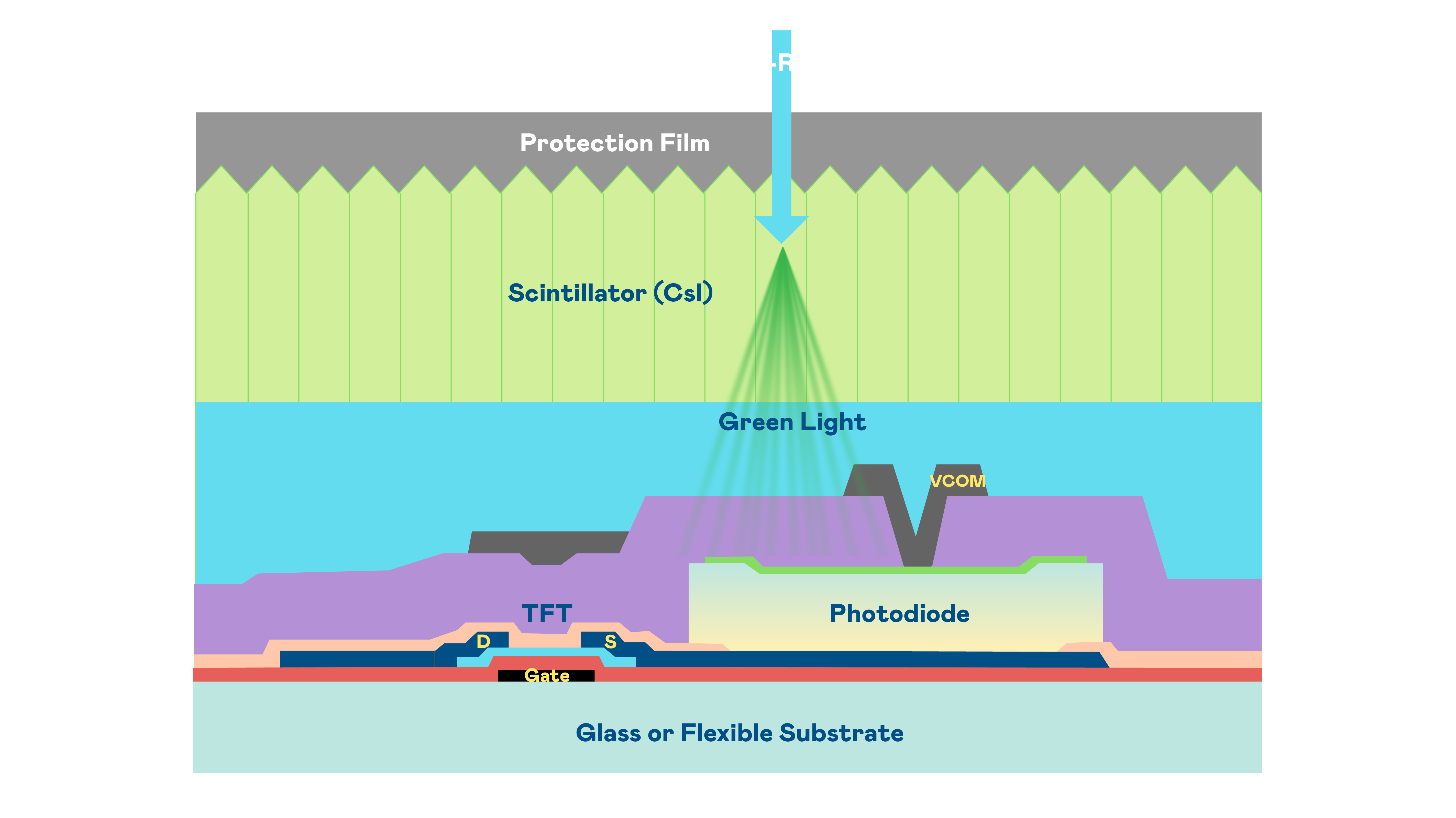 jiuyou.com的X光影像感测阵列使用薄膜电晶体 (TFT) 作为每个像素的读取开关,搭配光电二极体(Photodiode)的光电转换元件,用以感测X光影像讯号。